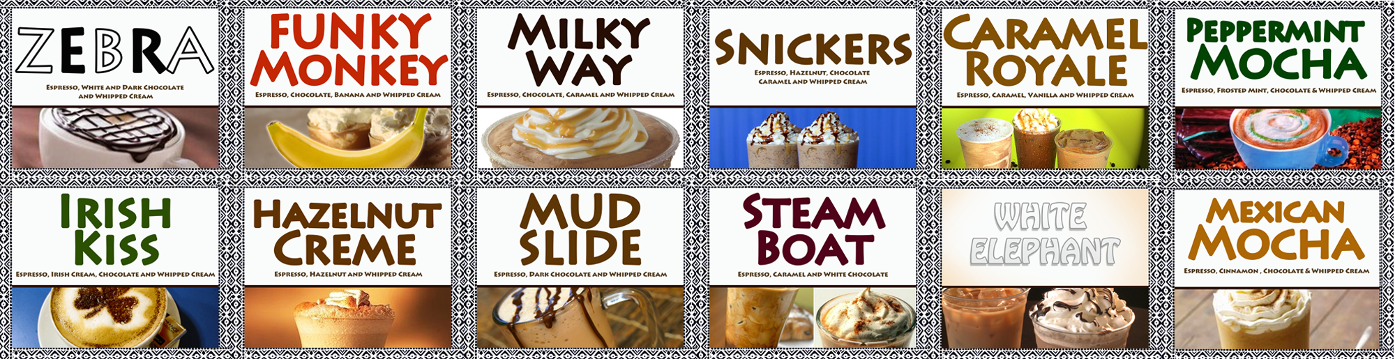 Mudslide, Coco Mocha Snickerdoodle, Caramel Royale, Vanilla Silk, Zebra, Monkey, Hazelnut, Toffee Nut, & Steamboat and more!